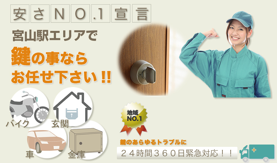 当社では、宮山駅の一般的なご家庭の玄関から車、バイク、金庫の鍵のトラブル解決を神奈川/横浜エリアで承っております。また、鍵開けだけでなく、鍵の交換も承っています。以前に比べ個人としての防犯対策が注目されてきていますが、 皆さんの対策は万端ですか?空き巣などは年々手段が多様化し、巧妙になってきています。 泥棒に入られてからでは遅すぎます。ピッキングや破壊に対する防犯性の高い商品を数多く扱っておりますので、 ぜひ宮山駅でお考えの際は鍵屋のカギのドクターまでお問い合わせ下さい。また、鍵の紛失などによる鍵開けは24時間36日緊急対応可能。鍵の閉じ込みや紛失などによる鍵の作成も承りますので、宮山駅以外にも神奈川・横浜エリアで鍵の事でお困りなら、すぐに鍵屋のカギのドクターまでご連絡下さい